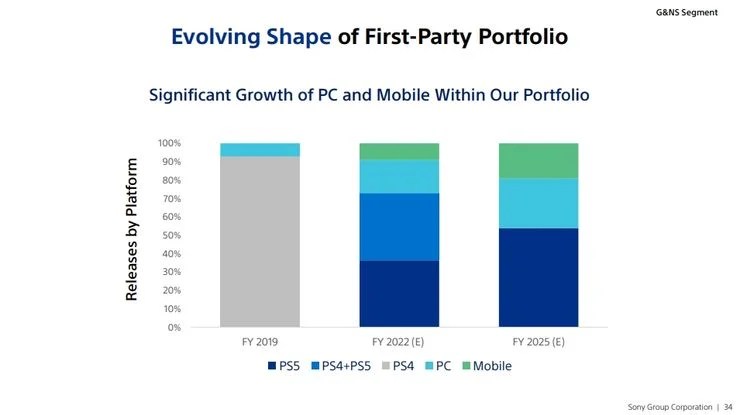 Sony piti äskettäin sijoittajaesityksen, jossa keskityttiin PS4:n ja PS5:n kasvuvertailuihin. Esityksen osiossa “Evolving Shape of First-Party Portfolio” Sony vertaa alustatukeaan kolmelta eri vuodelta: 2019, 2022 ja 2025. Vuonna 2019 PS4 muodostaa 90 % Sonyn julkaisuista ja 10 % PC:llä. . Vuoden 2022 julkaisuista noin 35 % on PS5:llä ja 35 % sekä PS4:llä että PS5:llä. Vuoden 2025 kaaviossa näkyy, että PS5-julkaisut muodostavat 50 % kaikista Sonyn pelijulkaisuista, eikä PS4-julkaisuja ole ollenkaan.